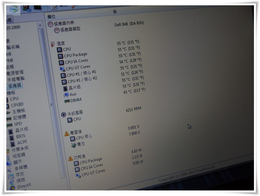 透過AIDA 64 檢視 CPU 溫度為 55 度左右。