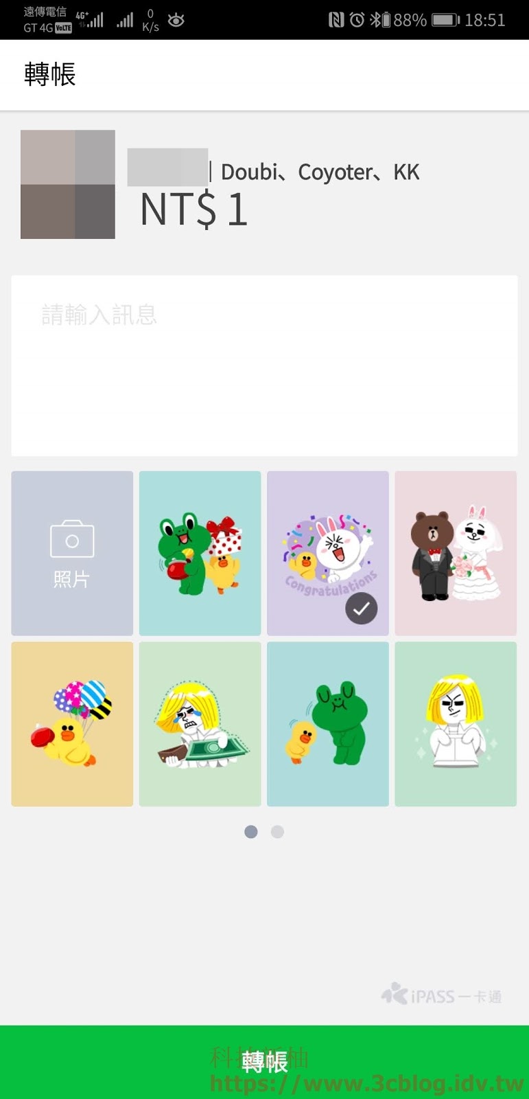 ▲ 轉帳的時候可以留言並選擇一個附加的圖案。